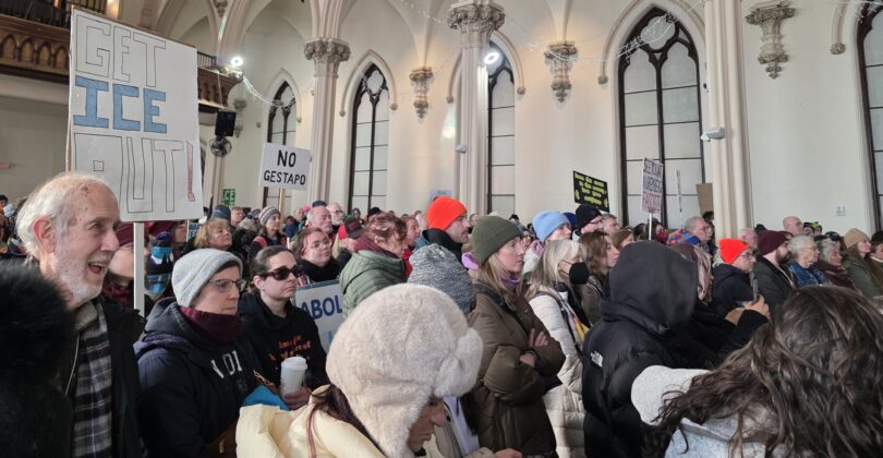 While a capacity crowd of around 700 filled the space inside, hundreds more stood outside in frigid temperatures, chanting anti-ICE slogans.