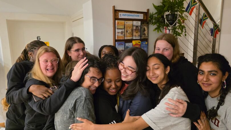 A group hug at YJI's home in Cape Town. From left to right: Mayama Opare, Norah Springborn, Mary Majerus-Collins, Anya Farooqui, Anjola Fashawe, Akhona Alwar, Gemma Christie, Shiara Naveen, Lina Marie Schulenkorf and Arooj Khalid. (YJI)